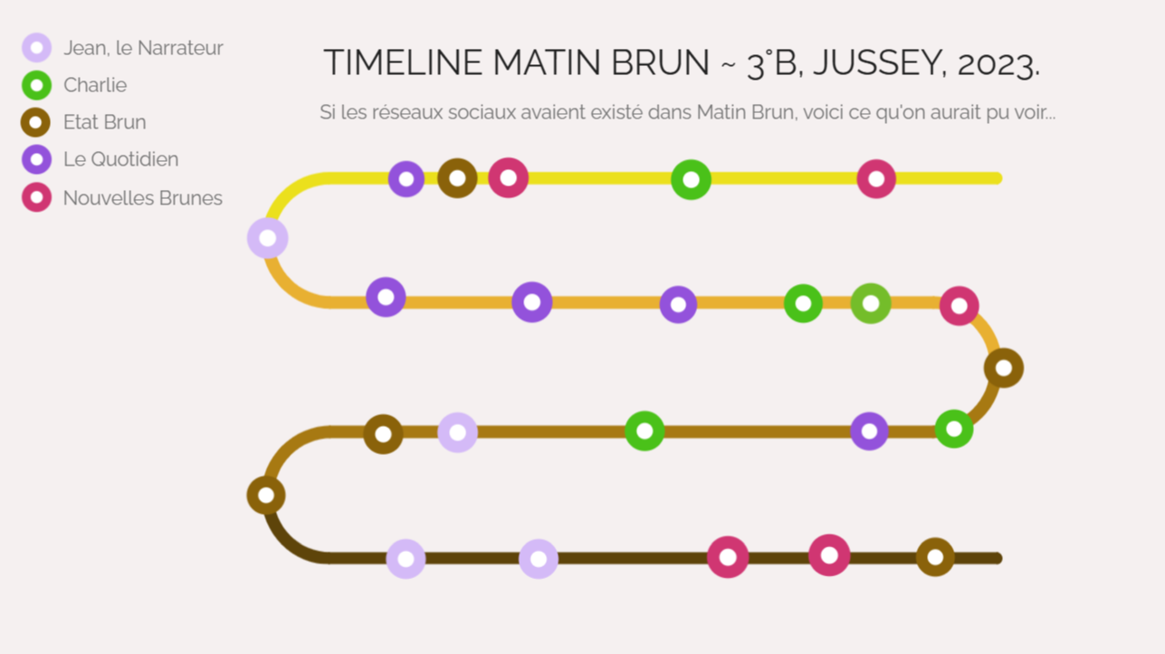Déroulement de l’activité : En classe, lecture de l’œuvre choisie. Composition de groupes de 3 ou 4 élèves s’attribuant une identité de l’œuvre : Matin brun : le narrateur, Charlie, l’Etat Brun, Les Nouvelles Brunes, Le Quotidien Antigone : Antigone, Créon, Ismène, Hémon, le chœur /le prologue et/ou un garde (une voix populaire qui jettera un regard externe) à décider avec les élèves. 1. Dans les groupes, commencer par faire un point sur la situation initiale du personnage attribué : repérer les éléments connus de son identité dans l’œuvre + ses « actions » principales. 1h brouillon. 2. Chaque groupe travaille au brouillon sur ses projets de publication (en lien étroit avec le texte) : donner vie à chaque identité avec 4-5 publications (minimum), photos (prises au maximum par les élèves eux-mêmes), statuts. Les faire réfléchir à la chronologie de leurs publications. 1h brouillon + 2 à 3h sur écran (création des publications). 3. Travail de mise en commun des publications via un pad partagé (Framapad) avec implication du professeur-documentaliste : demi-groupes pour travailler plus facilement, sur deux salles différentes. Le but est de créer une trame chronologique globale et de vérifier que les publications créées peuvent s’enchaîner de façon logique et se répondre. C’est aussi l’occasion de faire le point sur d’éventuels ajouts à faire. 1h classe. 4. Retour en salle informatique pour compléter les publications ou corriger, le cas échéant, certaines publications. 1h classe (éventuellement). 5. Les élèves font parvenir au professeur les publications numérotées que le professeur installera sur une page interactive genial.ly (avec insertion du texte en lien) avec ou sans l’aide d’un ou plusieurs élèves. |