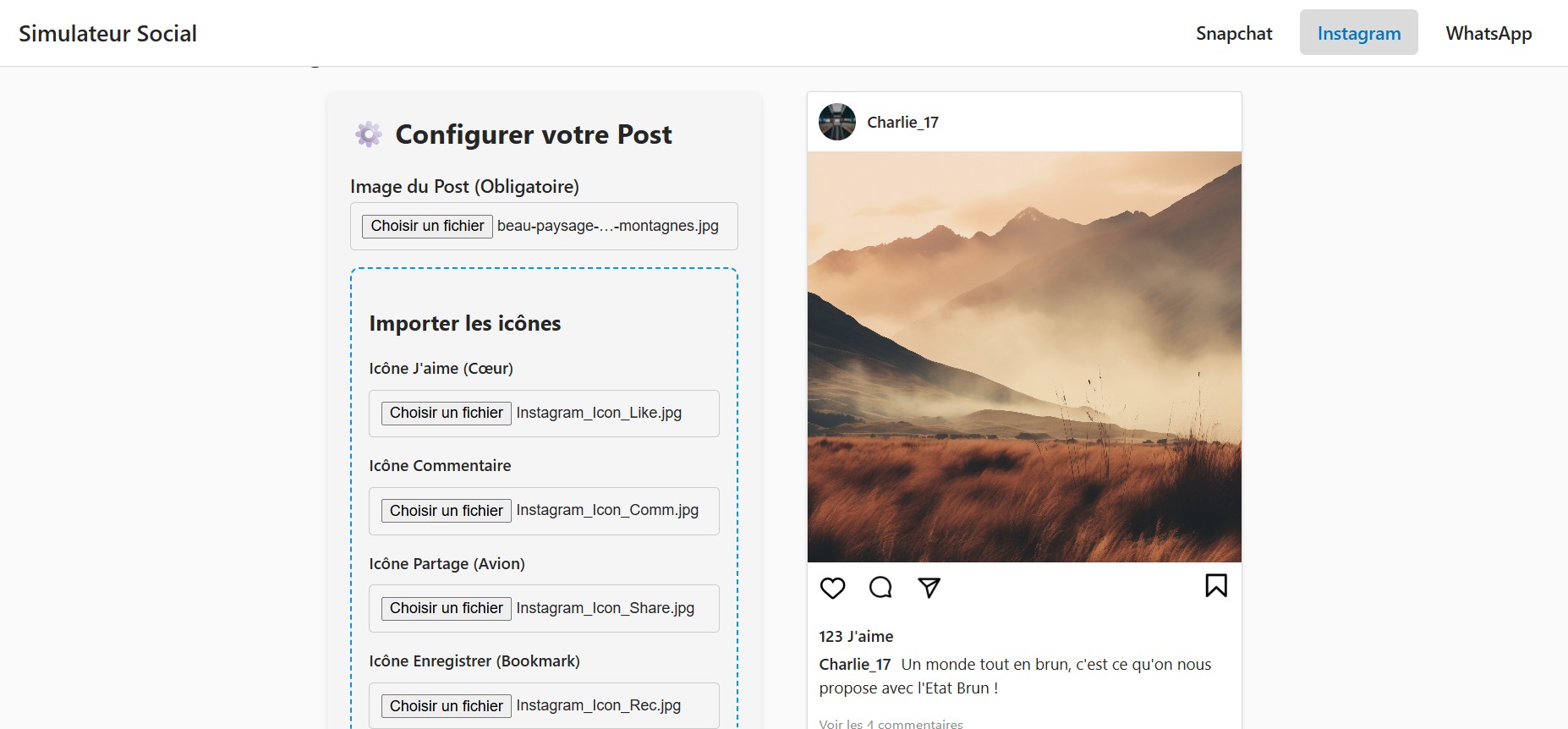 – Avoir lu et éclairé le texte avec les élèves (contexte notamment). – Aborder les risques et limites du numérique : facilité de faire un faux, arnaques, hoax/infox, etc. + droit à l’image (aide possible du professeur documentaliste). – Avoir téléchargé sur les ordinateurs/tablettes l’outil mimétique gratuit, RGPD (pas de compte, pas d’enregistrement en ligne, pas de publicités) proposé par l’Atelier Canopé 25 – Besançon (création de Sébastien Damien) : outil mimétique de publications de réseaux sociaux ➡️cliquez sur le lien Pour créer la publication Instagram, il vous faudra ajouter les icones cœur/commentaire/partage… que vous pouvez récupérer ici : icones Instagram