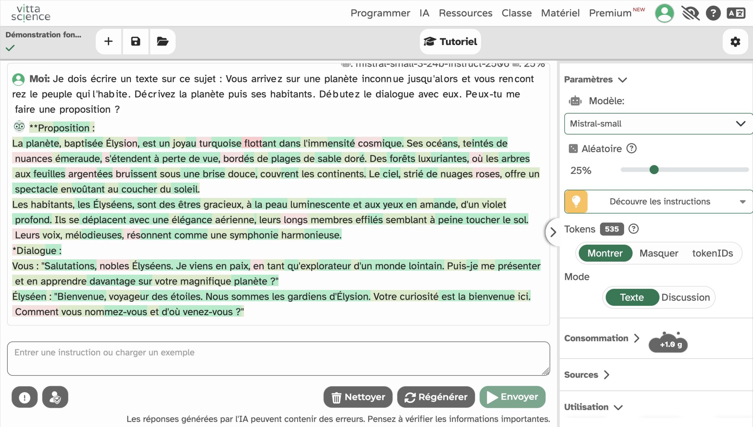 – En 5ème, le cadre d’usage de l’IA en éducation interdit toute manipulation. Toutes les démonstrations ont donc été faites par l’enseignante au tableau. A partir de la classe de 4ème, on peut imaginer faire prendre en main l’IA Vittascience par les élèves, travaillant sur la modification des Tokens par exemple, permettant ainsi de faire évoluer les résultats obtenus. – Un vidéo projecteur suffit donc, relié à un ordinateur connecté à Internet. – Par l’intermédiaire de Pronote et sous couvert de l’autorisation du chef d’établissement, une information aux familles de la classe a été faite suite à cette séance. – Capture et anonymisation de copies d’élèves recopiées d’après une IA ou de copies sans triche. – Vittascience |