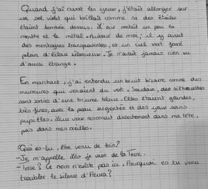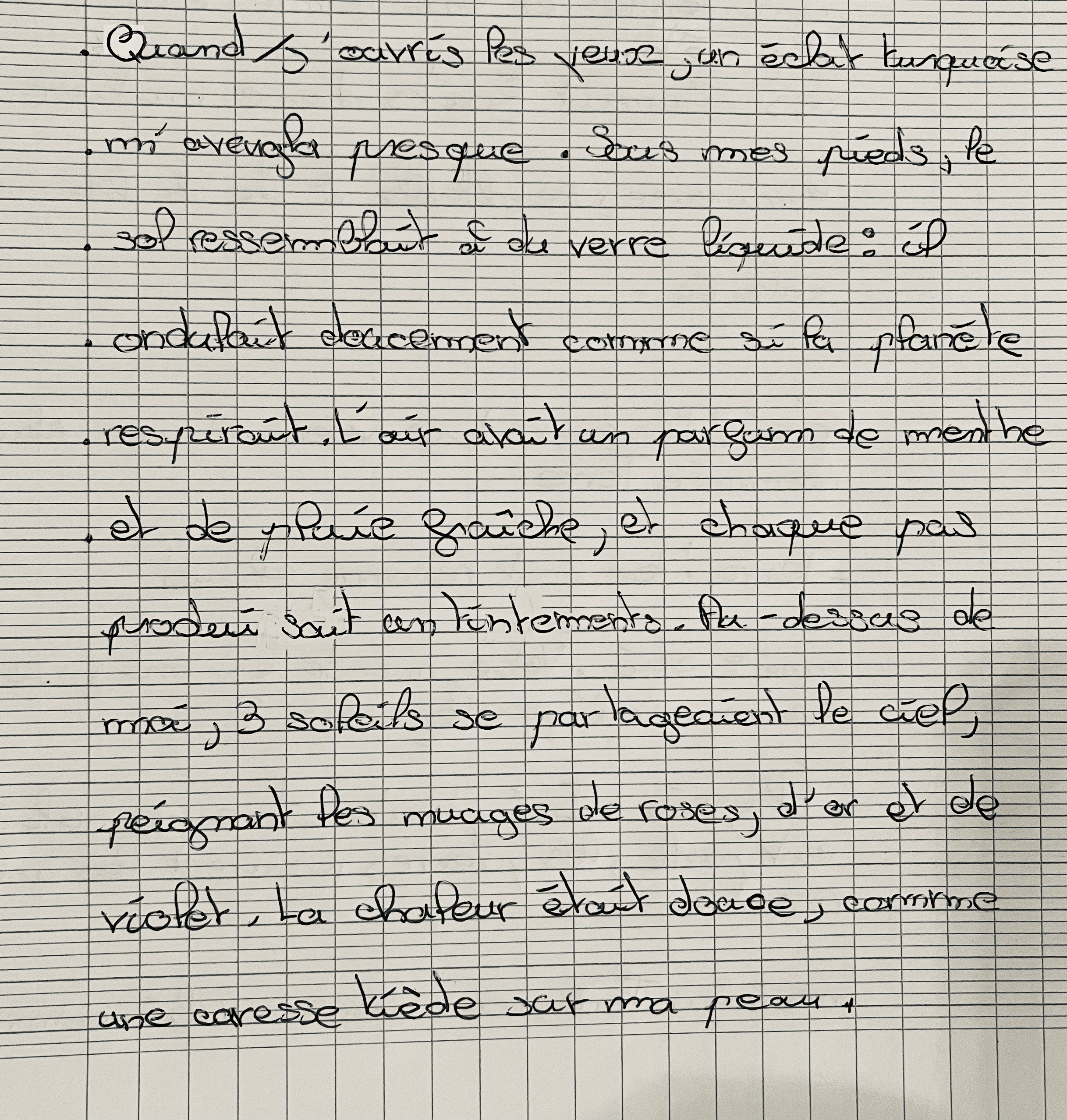 1. Correction de l’enseignante et repérage des copies potentiellement effectuées par l’IA (voir ICI un scenario de correction audio). Retrouvez le sujet complet proposé en classe pour cette expression écrite de fin de séquence : EE Planète nouvelle différencié