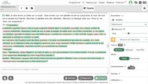 Mizou permet aux élèves d’échanger avec une IA conversationnelle (préconçue par l’enseignant). L’élève donne des consignes à son interlocuteur virtuel pour rédiger un texte (ici poétique). L’enseignant peut suivre les échanges entre l’IA et l’élève et en garde une trace sur son compte.